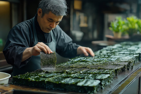 Sushi Chef Making Sushi in the restaurant kitchen. Man working with nori shee