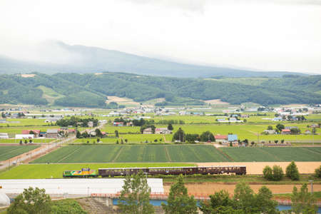 Furano, Hokkaido July 19,2019 : amazing aerial view of green landscape field of Furano in Hokkaido with local tourist train is running