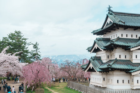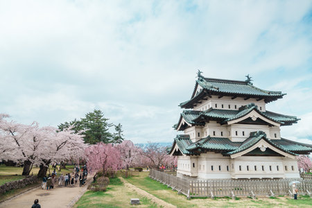 Beautiful Hirosaki Castle park with Sakura Cherry Blossom and Iwaki mount in Spring, traveling in Hirosaki city, Aomori, Tohoku, Japan. Landmark famous in Japan. Travel and Vacation destination