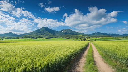 A picturesque landscape presents mountains under a sky filled with fluffy white clouds. The foreground features a vast, verdant field. The overall scene conveys a sense of tranquility. It might be suitable for various commercial or editorial applications such as travel, nature, or environmental themes.