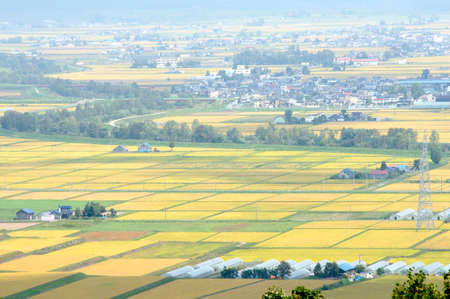 Beautiful countryside landscape of harvest field with farmland and mountains in the distance. Japan
