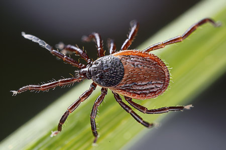 A detailed close-up image of a tick Ixodes scapularis, known as the blacklegged tick or deer tick, on a green leaf. This arachnid is a vector for Lyme disease transmission.