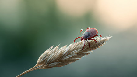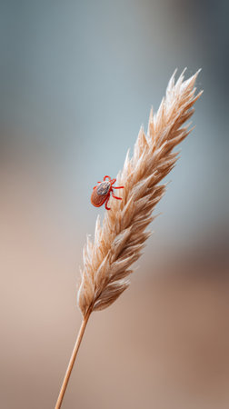 Tick patiently waiting on a wheat stalk poses a potential threat, carrying the risk of lyme disease and other tick borne illnesses for both humans and animals alike