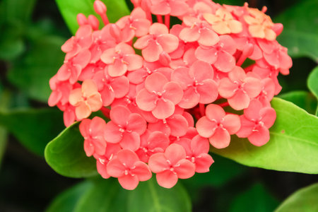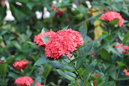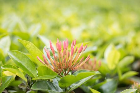 Close-up of Chinese ixora in the garden with green leaves. Flower and plant.