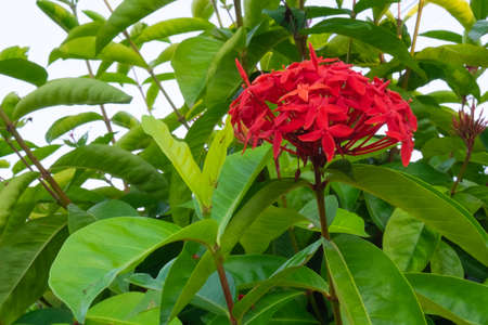 Red Ixora flower with green leaves in the garden, stock photo