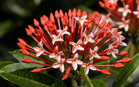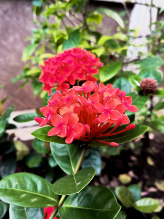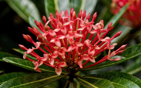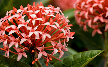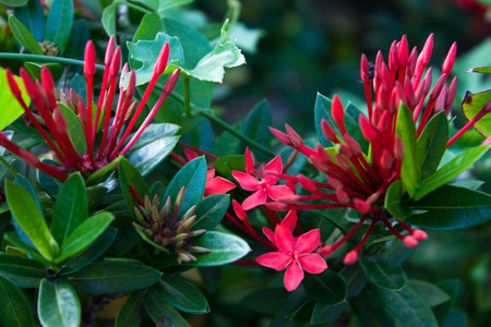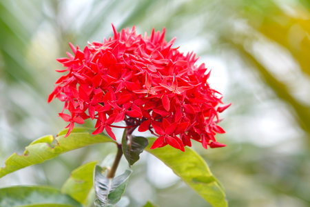 Ixora flower blossom in a garden. Red spike flower. Natural and flower background.