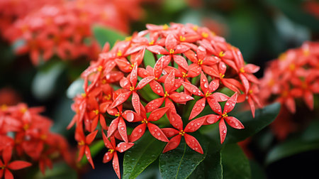 bright red Ixora coccinea flowers, also known as Scarlet Jungle Geranium or Flame of the Woods. Clusters of small, star-shaped blooms stand out against the lush green foliage. This image captures the intensity and beauty of these tropical flowers.
