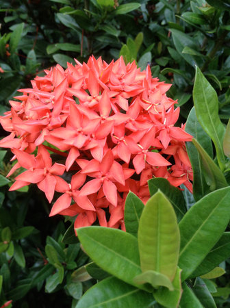 Red Ixora flowers with green leaves