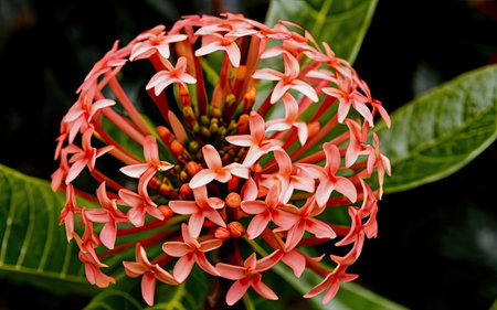 A close-up, vibrant shot showcasing a cluster of delicate orange ixora flowers surrounded by lush green leaves, highlighting their natural beauty and intricate detail.