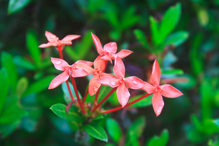 Group of red rubiaceae flower with water drop in nature