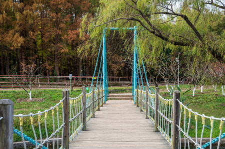 wooden bridge in deep forest, blue water. natural Summer end background in Japan