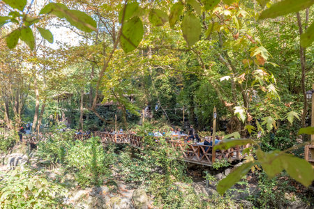 Unidentified people having breakfast at a restaurant in Masukiye,a popular destination for eating and spending time.Kocaeli.Turkey.22 October,2017
