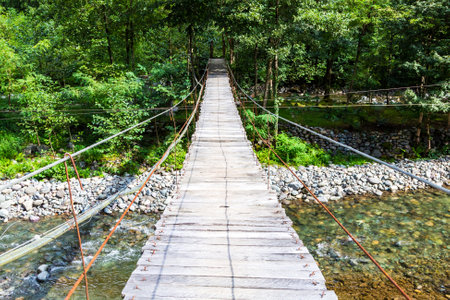 Old Suspension Bridge in the Forest. Adventure and Nature Concept