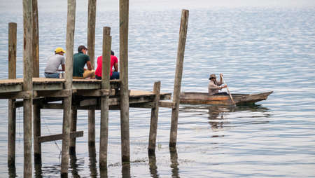 San Pedro La Laguna, Guatemala - May, 23rd, 2018: local kids sit on the wooden pier and canoe with fisherman