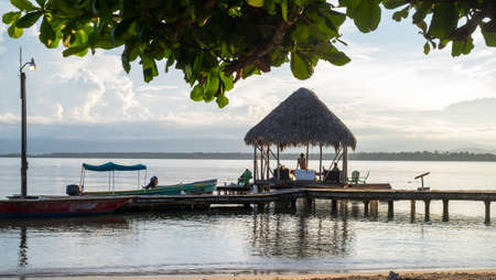 Bocas del Toro, Panama - September 11th, 2018: pier construction with tiki gazebo at the end during sunset at Boca del Drago beach