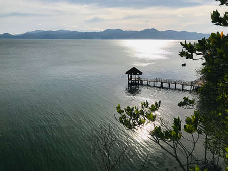 Trat, Thailand - December 19, 2020: Scenery of sea view pavilion that visible from the top floor of observation deck of 'Mature mangrove forest and black sand beach' in Trat, Thailand.
