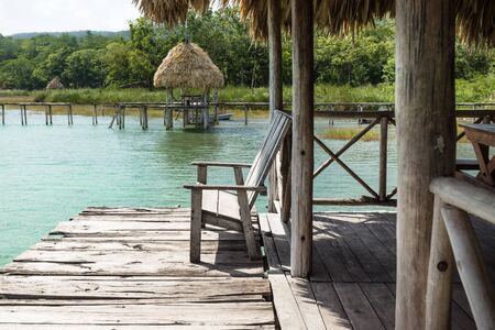 View from pier to the beach of Laguna Bacalar, Mexico
