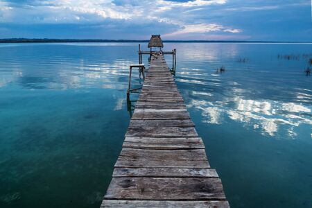 Wooden old dock during sunset with reflexions at lake Itza, El Remate, Peten, Guatemala