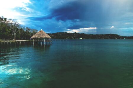 Wooden old dock during sunset with reflexions and massive raincloud at lake Itza, El Remate, Peten, Guatemala