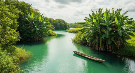 A vibrant turquoise river meanders through a dense tropical rainforest, showcasing nature's beauty and tranquility in a stunning landscape.