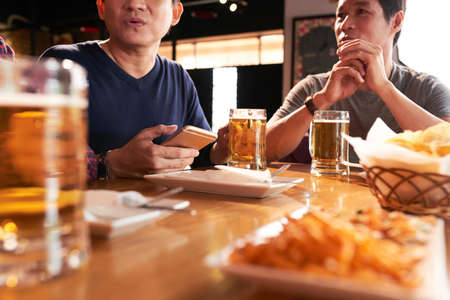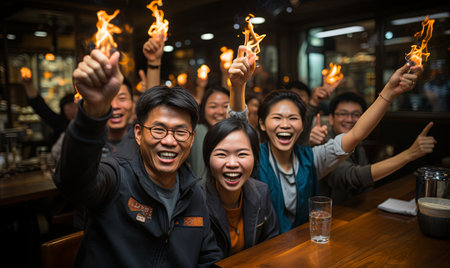 Young Japanese man and his friend excitedly raising their beer mugs in celebration at a trendy city bar.