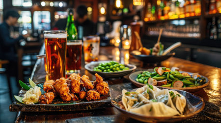 A selection of izakaya-style appetizers including edamame, karaage, and gyoza on a dimly lit bar table
