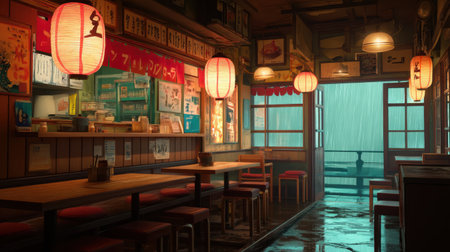 A serene interior of a traditional Japanese restaurant featuring warm lantern lighting, with rain cascading down the windows, creating a tranquil atmosphere.