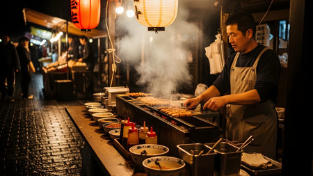 A chef grills yakitori skewers at a traditional Japanese street food stall illuminated by lanterns at night. Smoke and steam rise from the grill, creating an atmospheric and authentic culinary scene.