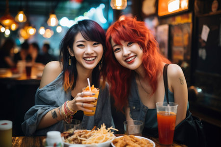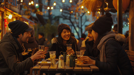 Friends from different cultures sharing a meal at an outdoor cafe, warm lighting, lively atmosphere, focus on laughter and toasts