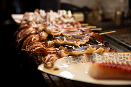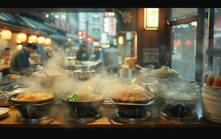 Authentic Japanese street food stalls with a variety of snacks and dishes, no people.