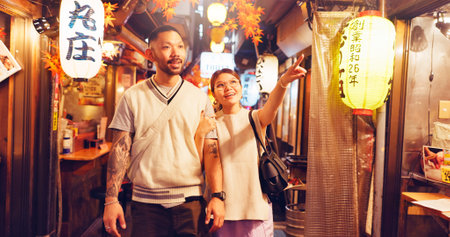 Couple, night and walking at town market in Japan, love and bonding on honeymoon vacation. People, pointing and outdoor support on holiday in city, travel together and explore culture or sightseeing