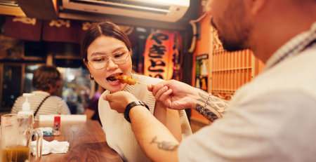 Japanese man, woman and feeding with Asian food in city for romantic dinner, meal or nutrition. Couple, eating and bonding together with cuisine, culture or recipe for sharing or night in restaurant