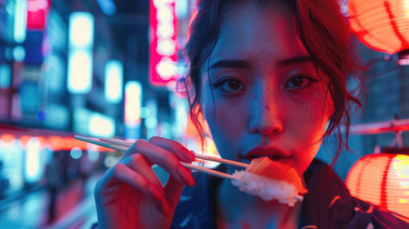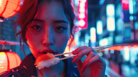 A woman with black hair is holding a tray of sushi, smiling with raised eyebrows and long eyelashes. Her facial expression exudes happiness and cool confidence, enjoying a leisurely and fun moment