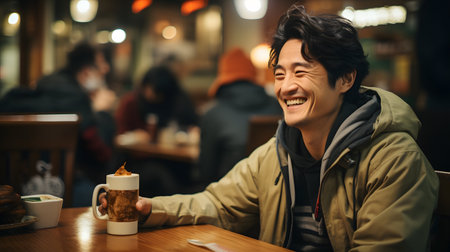 Young Asian man drinking coffee in a coffee shop in the evening.