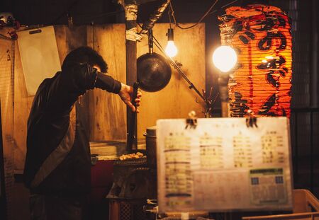 Worker of the restaurant preparing the food for the customer at traditional bar in Omoide Yokocho, Shinjuku. Portrait Orientation.