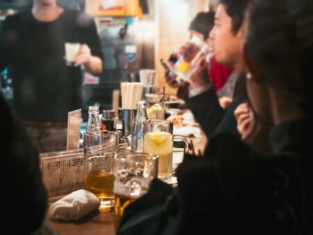 TOKYO, JAPAN - APR 11,2019 People drinking in Bar beer Local restaurant Japanese Salaryman Tokyo city Japan nightlife