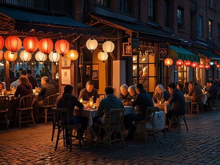 Bokeh background of street bar beer restaurant, outdoor in asia, people sit chill out and hang out dinner and listen to music together in avenue, happy life, work hard play hard. Generative AI