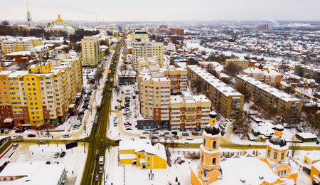 Aerial view of snow covered Penza overlooking Spassky Cathedral