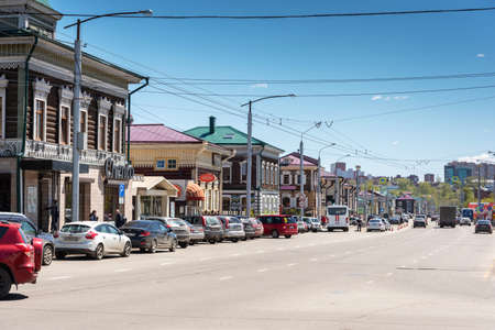 Russia, Irkutsk - May 27, 2021: Street of 130 Kvartal quarter Irkutsk Sloboda is a specially created area of historic buildings in the center of Irkutsk
