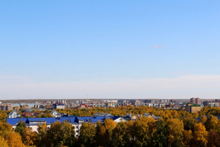 Autumn city on a sunny clear day. Yellow leaves on the trees. View from above.