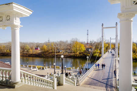 Ural river embankment, Orenburg, Russia - October, 18, 2020: Citizens walking on the pedestrian bridge