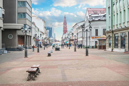 Bench and view of the high bell tower on Bauman Street in Kazan on a sunny day. Caption: Hotel Kazan. Caption: Beat the dishes! Caption: Book House