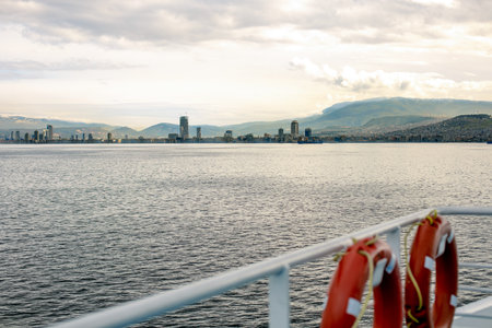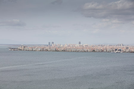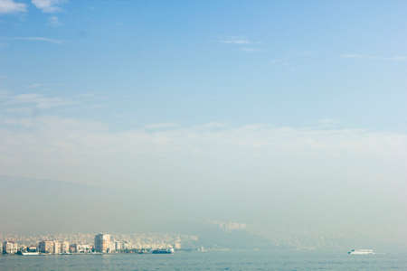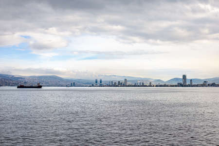 City view of Izmir from ferryboat. Cold grey winter Aegean sea.