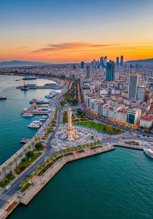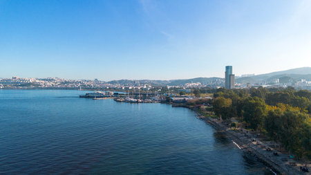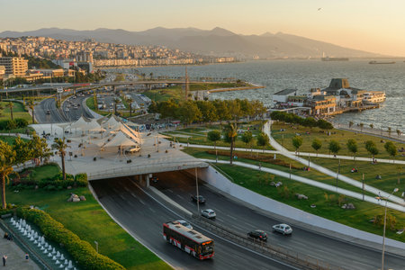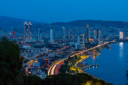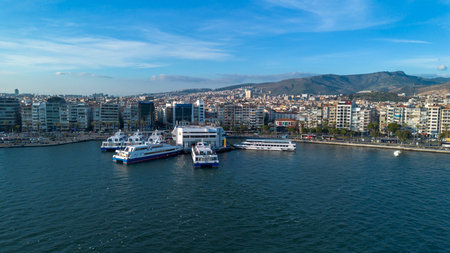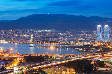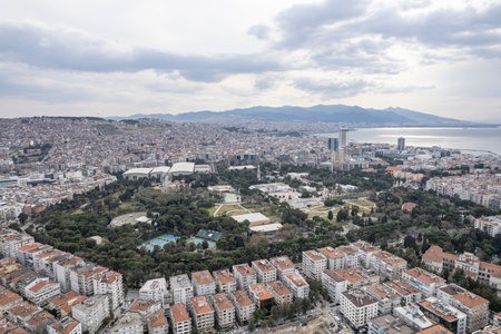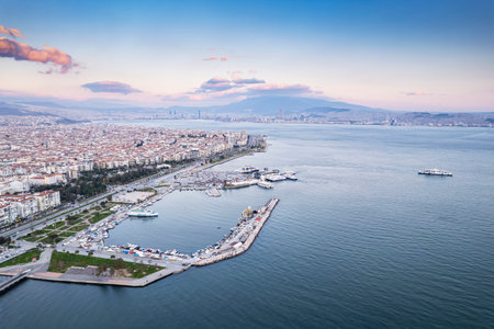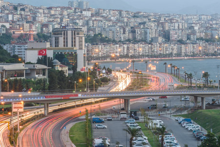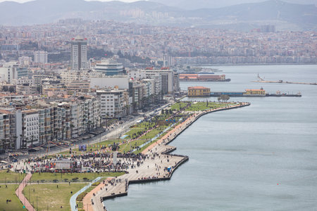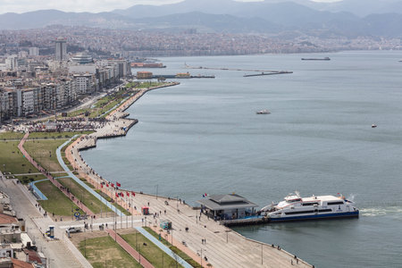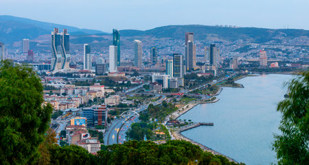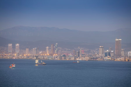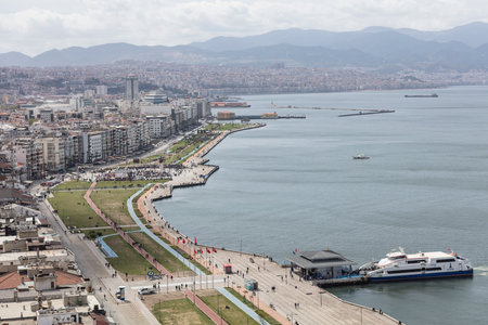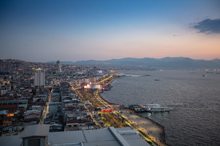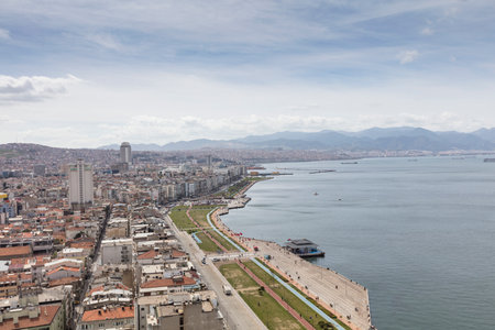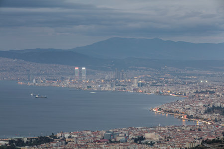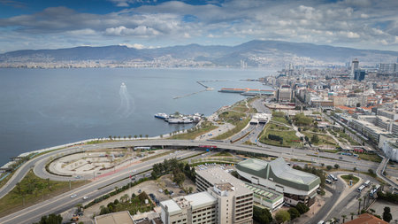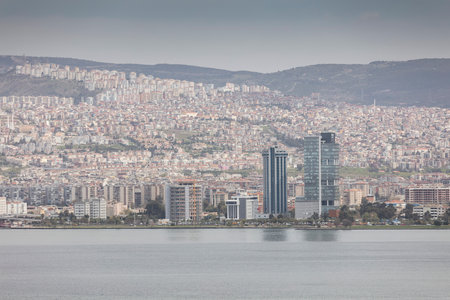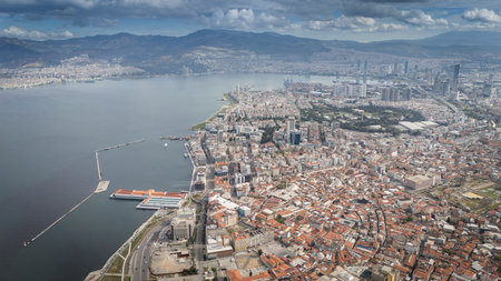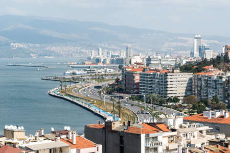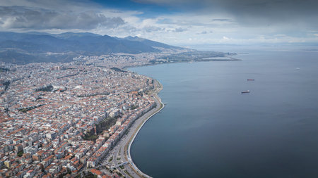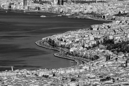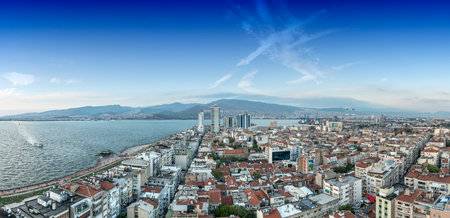 Awesome aerial view of scenic coastline of Izmir, Turkey. The Gulf of Izmir on the Aegean Sea is visible at the left. Amazing cityscape. The city is a popular tourist destination in Turkey.