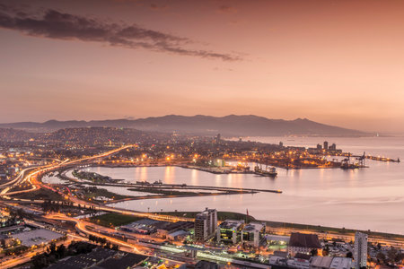 View of Izmir Bay in the evening from the high hill of Bayrakli. Long exposure, low light.