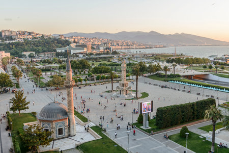 Konak Square street view with old clock tower at sunset. It was built in 1901 and accepted as the official symbol of Izmir City, Turkey.