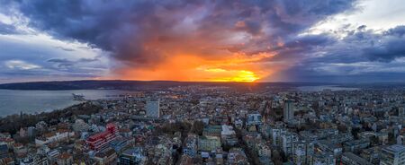 Amazing colorful sunset over the city. aerial panoramic view from drone, Varna city, Bulgaria