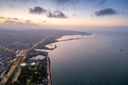 Aerial city center and port at night. Samsun, Turkey