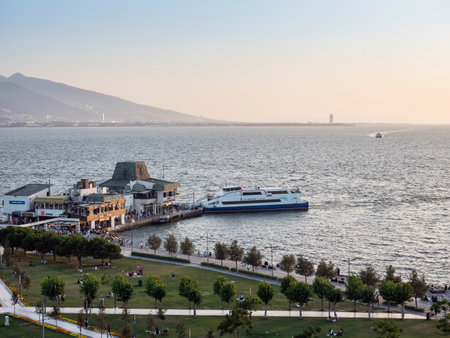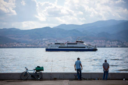 Goztepe, Izmir - Turkey- 04-22-2021: A ferry is approaching at the Goztepe Ferry Pier. People on the beach are cycling or hiking.