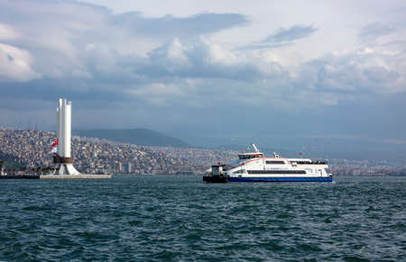 City view of Izmir from ferryboat. Cold grey winter Aegean sea.